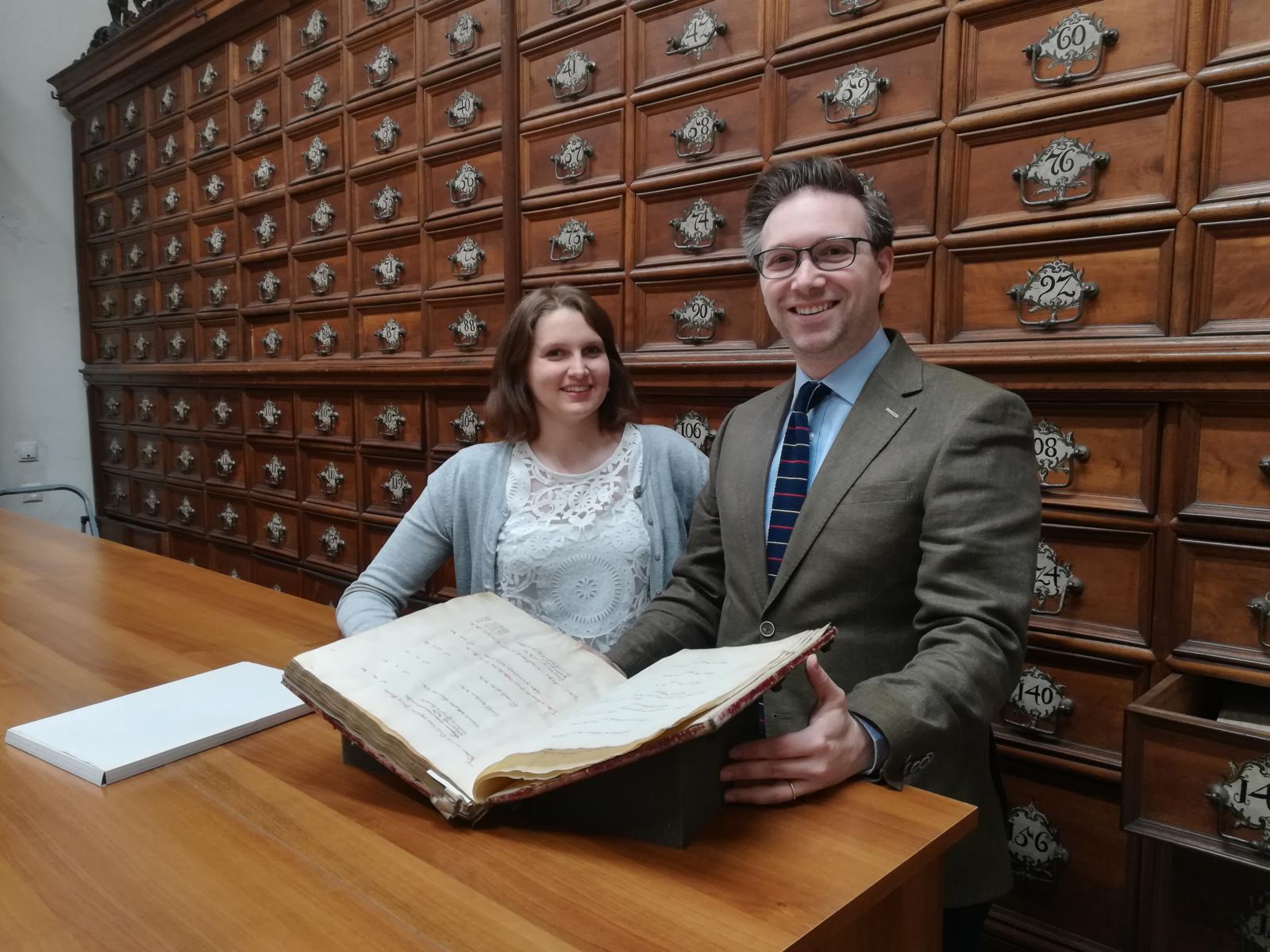 Abb. 1: Stiftsarchivar Dr. Maximilian Alexander Trofaier und Mag. Larissa Rasinger, MA. (Foto: Ordensgemeinschaften Österreich)