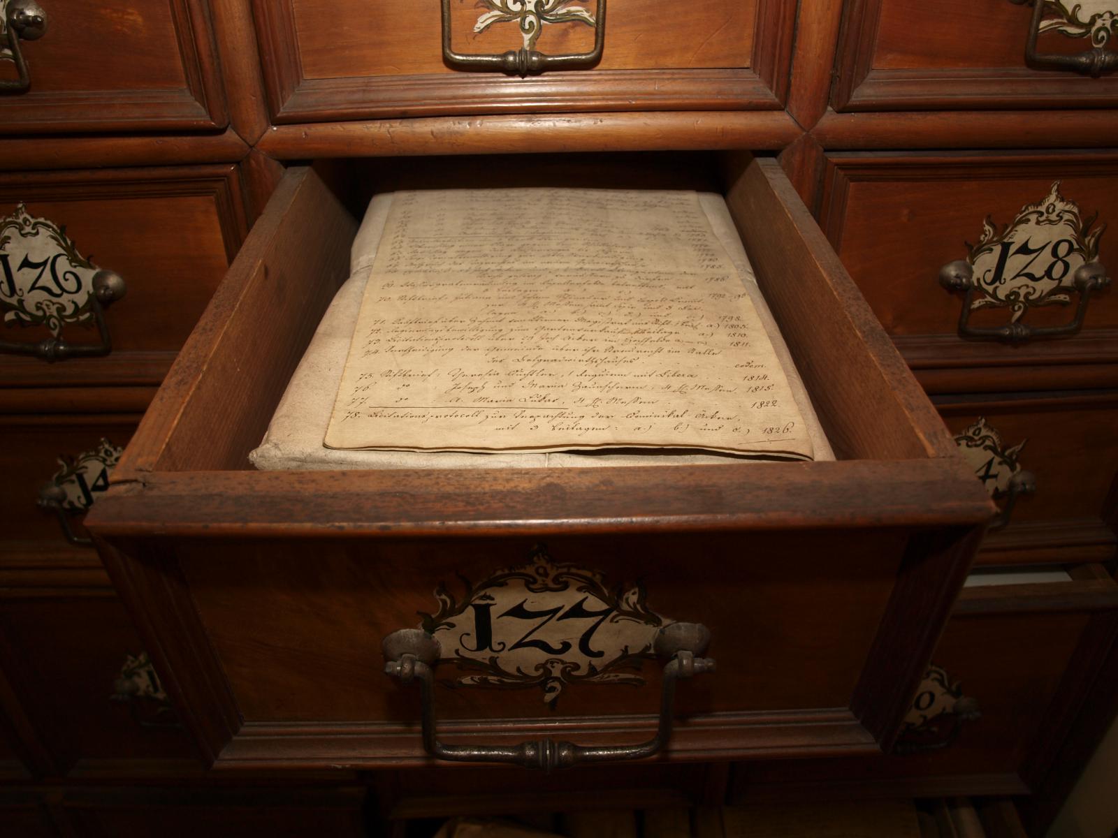 Abb. 3: Die Aufbewahrung von Aktenmaterial erfolgte früher oft in Laden. (Foto: Schottenstift Wien)