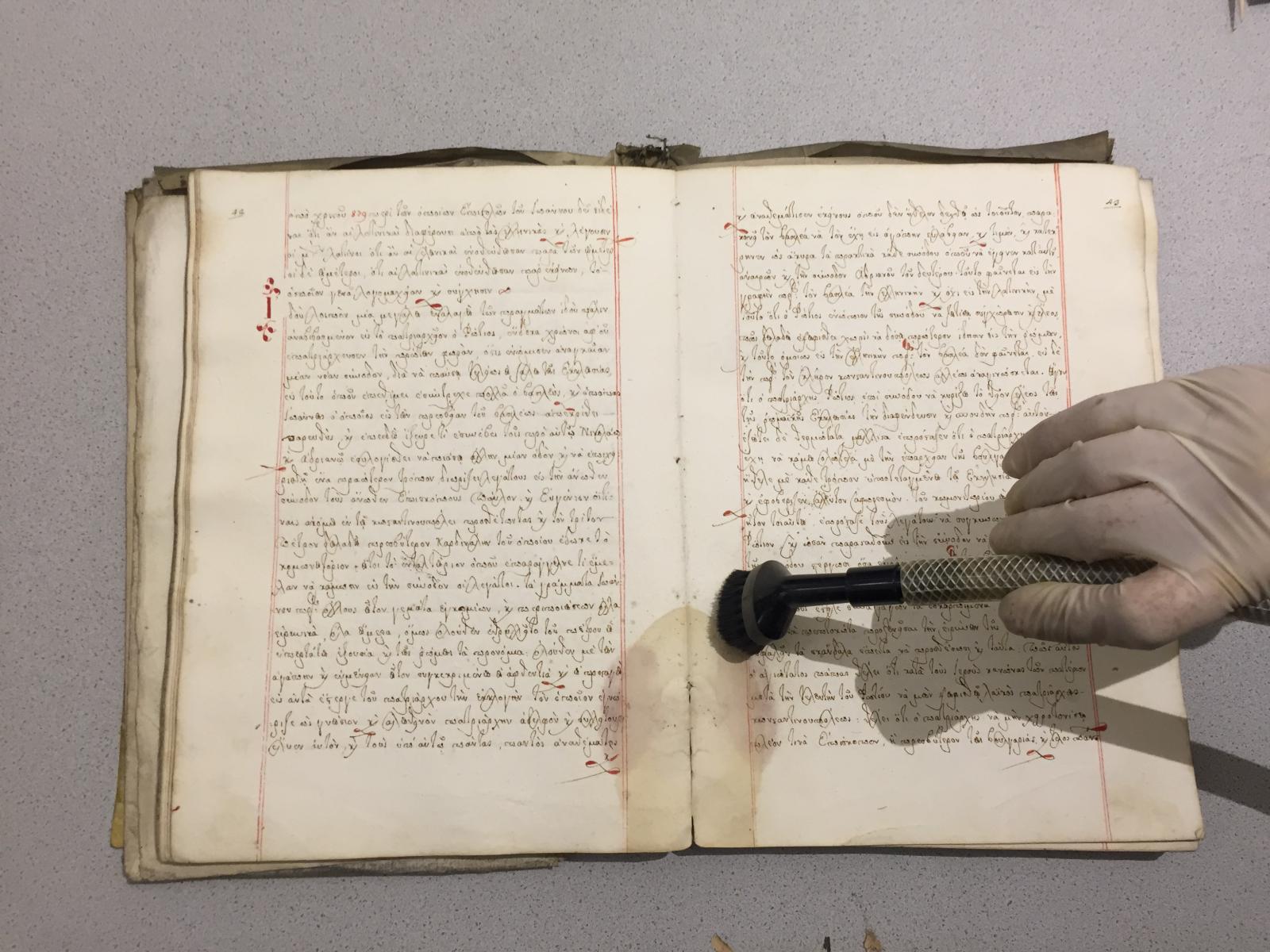 Abb. 4: Mittelalterliche Handschriften werden fachmännisch von Schimmel und Staub gereinigt. (Foto: Schottenstift Wien)
