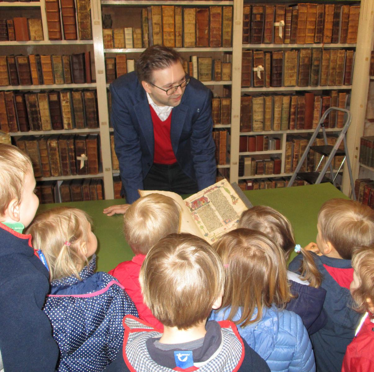 Abb. 7: Stiftsarchivar Maximilian Alexander Trofaier zeigt einer Gruppe Kindergartenkinder eine mittelalterliche Handschrift. (Foto: Schottenstift Wien)