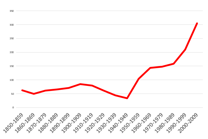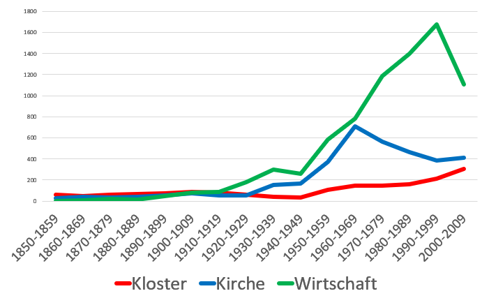 Dass die Anzahl kirchenhistorischer Publikationen in den 1960er Jahren, zur Zeit des zweiten Vatikanischen Konzils und tiefgreifender Veränderungen in Struktur und Gehalt kirchlicher Institutionen, einen Höhepunkt erreichte und seitdem im Abnehmen begriffen ist, verwundert nicht: Der gesellschaftliche Bedeutungsverlust der Kirchen ist evident und fortschreitend. Dass die wirtschaftshistorische Forschung in den neoliberalen Nachwendejahren einknickte, geht nicht mit einer abnehmenden Relevanz ökonomischer Systeme einher, sondern mit der Skepsis an deren Veränderbarkeit. Auch das geringer werdende kirchenhistorische Forschungsinteresse könnte mit der Rezeption einer starren, reformresistenten Kirche zu tun haben: Ohne Visionen erscheinen Traditionen sinnentleert.