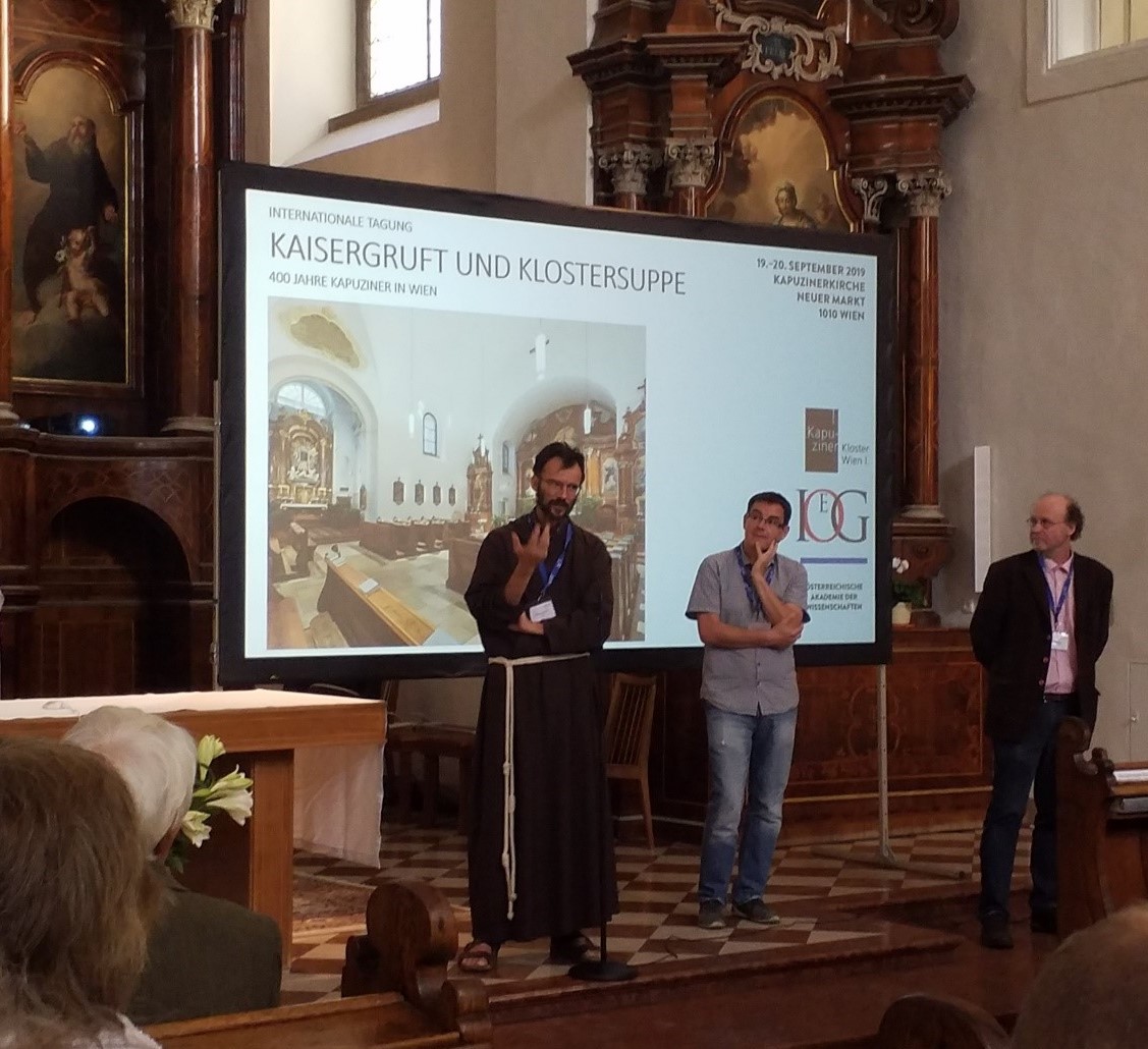Martin Scheutz (Universität Wien) brachte in seinem Vortrag über „Die Ansiedelung des Ordens in Österreich im Zeitkontext“ eine moderne Fachterminologie ein, um die historische Bedeutung der Kapuziner für ein heutiges Verständnis zu erklären. So bezeichnete er sie als „Low cost“-Orden, weil ihre Gründung weniger kostete als etwa die Stiftung eines Jesuitenkollegs, was mit der Tätigkeit der Kapuziner zu tun hat, die keine Schulen oder Spitäler führten. Wegen ihres besonderen pastoralen Wirkens im Zeitalter der Gegenreformation bezeichnete er die Brüder als „flexible konfessionelle Dienstleister“ und sprach in Bezug auf die Angebote ihrer Klöster besonders für die Stifter (Stiftergruften, Eremitagen) von „Product-Placement“. Derlei Begrifflichkeit transponiert eine für viele fremde Ordenswelt in den Verständnisrahmen der Gegenwart.