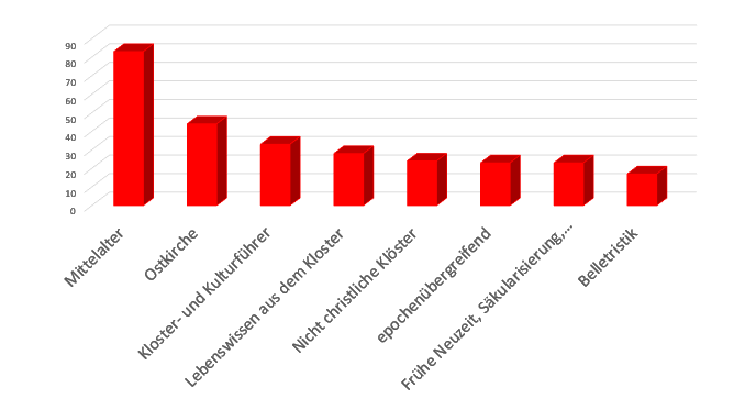 Die neuzeitliche Forschung konzentrierte sich auf epochenübergreifende Darstellungen – im untersuchten Zeitraum erschienenen die Austria benedictina und das Österreichische Chorherrenbuch – , weiters auf die Säkularisation, die 2003 ihr 200jähriges Gedenken beging, auf den Nationalsozialismus und auf die Frühe Neuzeit, Stichwort Konfessionalisierungsparadigma. Aber diese Klosterforschungen sind weit abgeschlagen und liegen nur knapp vor den belletristischen Publikationen, die in wissenschaftlichen Bibliotheken zu haben sind (in Wahrheit dürfte es also wesentlich mehr davon geben) und die Titeln wie „Das Geheimnis spanischer Nonnen“ oder „Tod im Skriptorium“ tragen.
