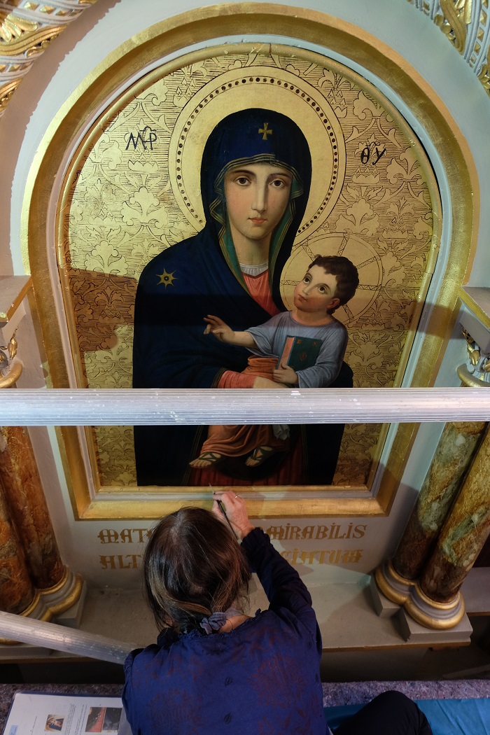 Restauratorin Brigitte Futscher während der Restaurierung am Hochaltarbild (c) Ordensgemeinschaften Österreich