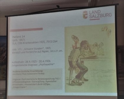 Ulrike Feistmantl vom Salzburger Landesarchiv berichtete dann über ein Forschungsprojekt am Bestand der Patientenakten der Christian-Doppler-Klinik. Die Kunsthistorikerin Elisabeth Telsnig hat sämtliche Akten auf kreatives Schaffen von Patient*innen durchgesehen und in den insgesamt 27.800 Akten in zweijähriger Recherchearbeit 153 Akten ausfindig gemacht, denen Zeichnungen von Patient*innen beilagen. Das Interesse am Kunstschaffen in psychiatrischen Einrichtungen ist in der Kunstgeschichte ein etabliertes Thema und als eigenes Genre, als „art rude“ („rohe Kunst“), bekannt. Die Ergebnisse wurden von Feistmantl und Telsnig in dem Buch „…Trotl bin ich nicht“ (Salzburg 2018) publiziert. Im Lentos-Kunstmuseum in Linz wurden im Sommer 2019 einige Stücke in der Ausstellung „Extraordinaire“ gezeigt.