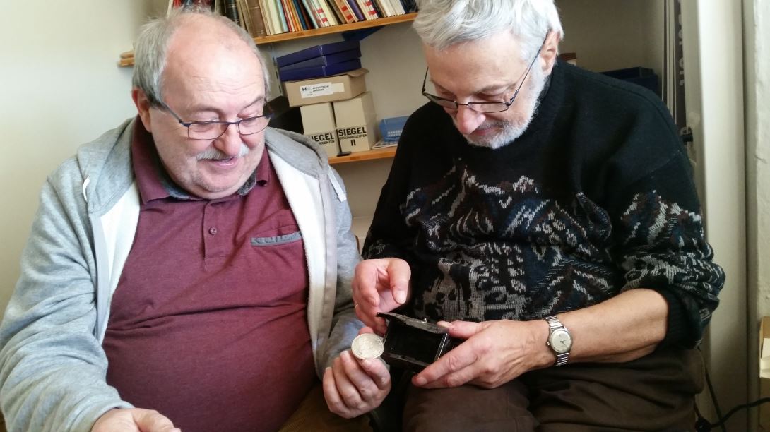 Die Numismatiker Claude Daburon und Wolfgang Szaivert mit dem Fund (c) Stift Kremsmünster, P. Josef Stelzer