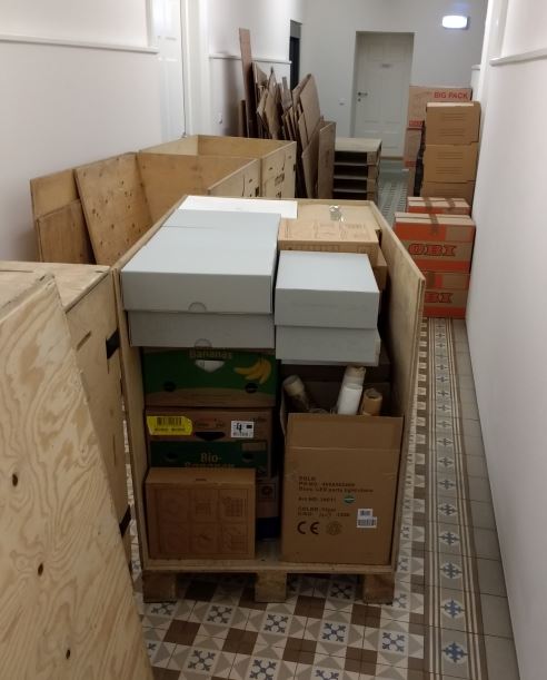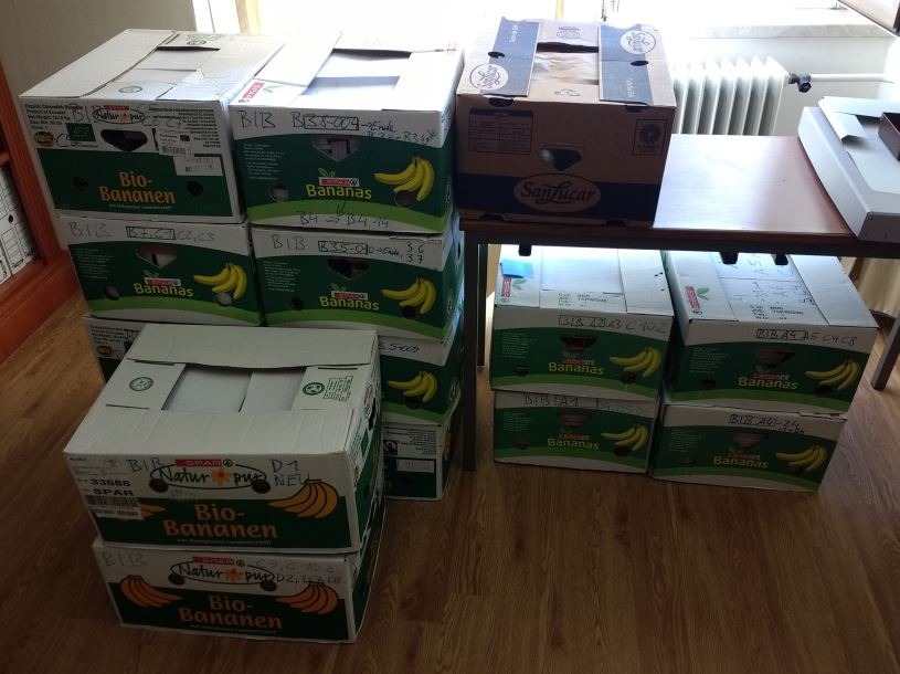 Abb. 2: Teil der Archivbibliothek, in stabile Bananenschachteln verpackt und beschriftet. (c) Lukas Winder.