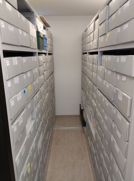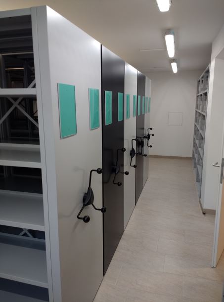 Der Auszug aus Riedenburg bedeutete also für uns eine mehrfache Herausforderung mit viel Arbeit, aber auch am neuen Archivstandort in Wien wurde im Vorfeld einiger Aufwand betrieben, um dem Provinzarchiv eine geeignete neue Heimstatt zu geben. Ein bisher anders genutzter großer Kellerraum war als neues Archivdepot vorgesehen, musste dafür aber ausgeräumt und adaptiert werden. Um den Platzbedarf für das schon vorhandene und noch zu erwartende Archivgut zu decken, war der Einbau von Rollregalen unbedingt erforderlich, die wiederum aufgrund ihres großen Gewichts bei voller Beladung eine Verstärkung des Fußbodens nötig machten. Außerdem wurde die elektrische Anlage mit Brandschutzschaltern ausgerüstet und die Beleuchtung an die neuen Rollregale angepasst. In weiterer Folge wurden auch durchsichtige Hitzeschutzfolien an den Fenstern angebracht, um möglichst wenig Wärme von außen eindringen zu lassen.