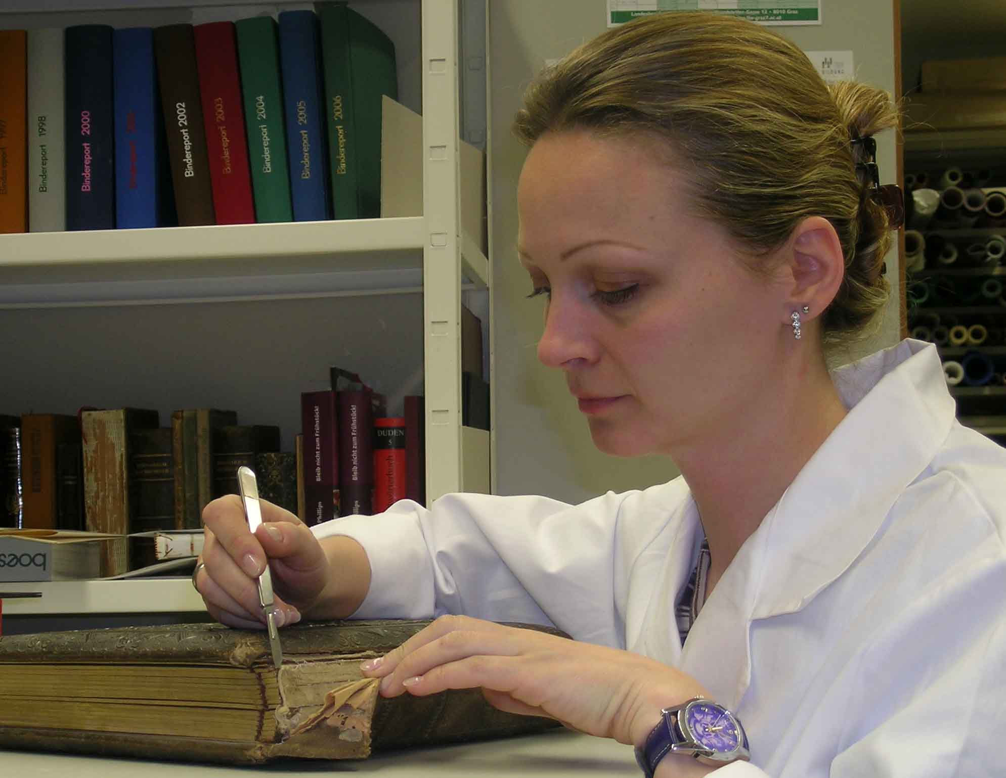 Sobald so ein „Patient“ einen Buchpaten gefunden hat, wird man dieses Werk wieder gerne in die Hand nehmen können. Dafür sorgen zwei akademische Buchrestaurator*innen, die mit fachmännischer Behutsamkeit die Schäden beheben. Eine davon ist Mag. Gudrit Sixl-Fuchs: „Als Buch- und Papierrestauratorin habe ich es mir zur Aufgabe gemacht, alte Bestände zu erhalten und vor dem Verfall zu retten, um ein kulturelles Erbe für die zukünftigen Generationen bewahren zu können. Neben dem Restaurieren stehen das Instandsetzen und das Konservieren. Mit Hilfe eines Restaurierberichts wird jedes Detail der Arbeitsschritte festgehalten und kann auch Jahre später von einem Restauratorkollegen nachvollzogen werden. Eine säurefreie Kassette mit einem Hinweis auf den Buchpaten, welcher die Restaurierung finanziell ermöglicht hat, schützt das restaurierte Buch für die nächsten Jahrhunderte“.