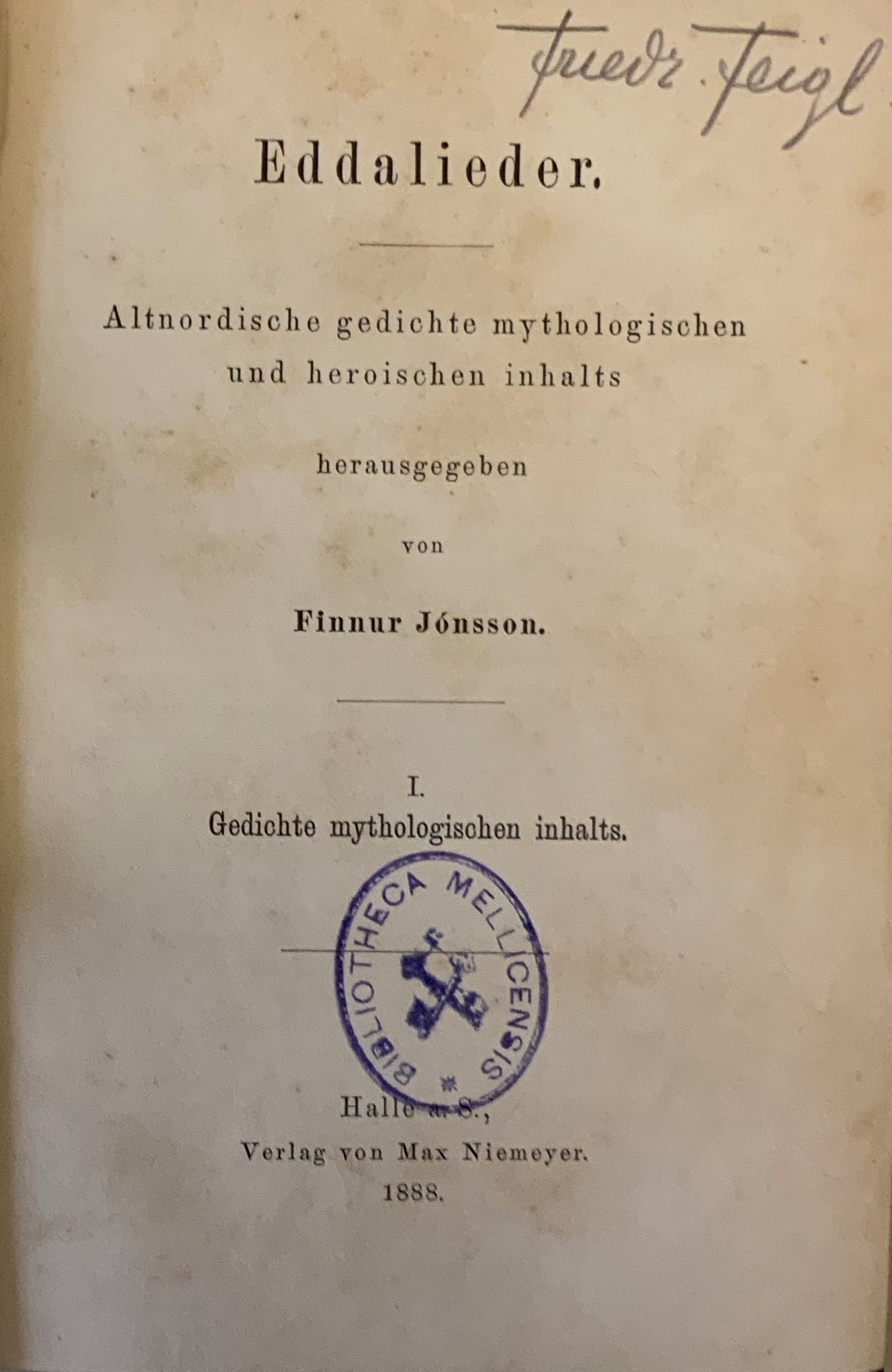 Bsp. für einen Provenienz-Eintrag: Friedr[ich] Feigl – Melker Benediktiner, Stiftsbibliothekar und Sprachwissenschaftler – weist sich als Vorbesitzer dieser Ausgabe der Edda-Lieder aus (StiB 46.243/2).