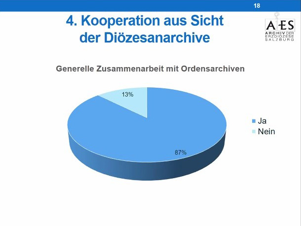 Ein positives Beispiel einer solchen Vernetzung über den kirchlichen Bereich hinaus präsentierte Peter Kramml vom Stadtarchiv Salzburg. Sein Vortrag stand unter dem Generalthema "Gelebte regionale Archiv-Kooperation in Salzburg". Kramml hob dabei u. a. die drei großen Salzburger Archive - das Landesarchiv, das Archiv der Erzdiözese Salzburg, und das Stadtarchiv Salzburg - hervor. Zwischen den drei Institutionen gebe es seit vielen Jahren Kooperationen auf vielfältige Weise. Man stimme sich bei Projekten wie auch Erwerbungen ab und finanziere u.a. auch gemeinsame Forschungsaufträge. Gemeinsam Publikationen seien ebenfalls Normalität.
