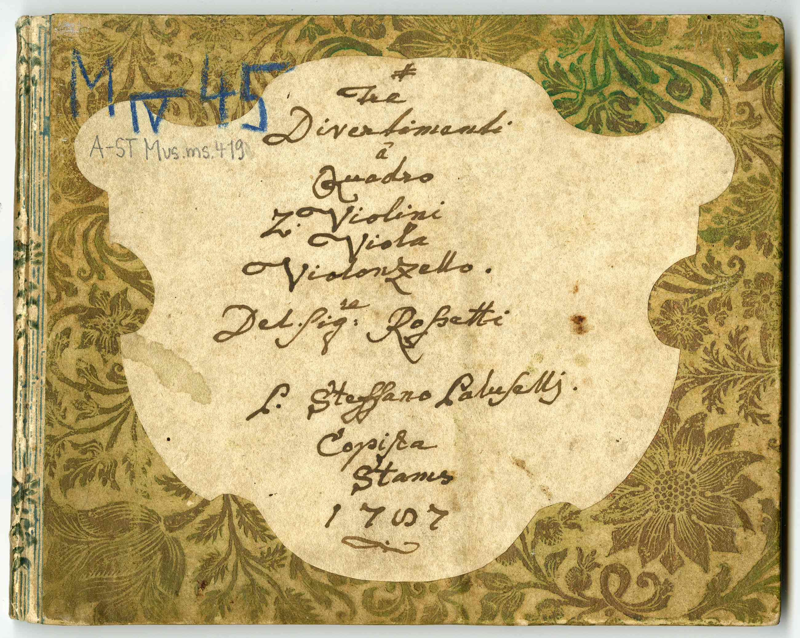 Abb.2: Einband zu drei Streichquartetten von Antonio Rosetti (1750-1792), Kapellmeister der Hofkapelle zu Öttingen-Wallerstein, in einer Partiturabschrift des Komponisten und späteren Stamser Chorregenten P. Stefan Paluselli OCist, 1787. Signatur A-ST Mus.ms. 419. Abb.: Archiv ITMf.