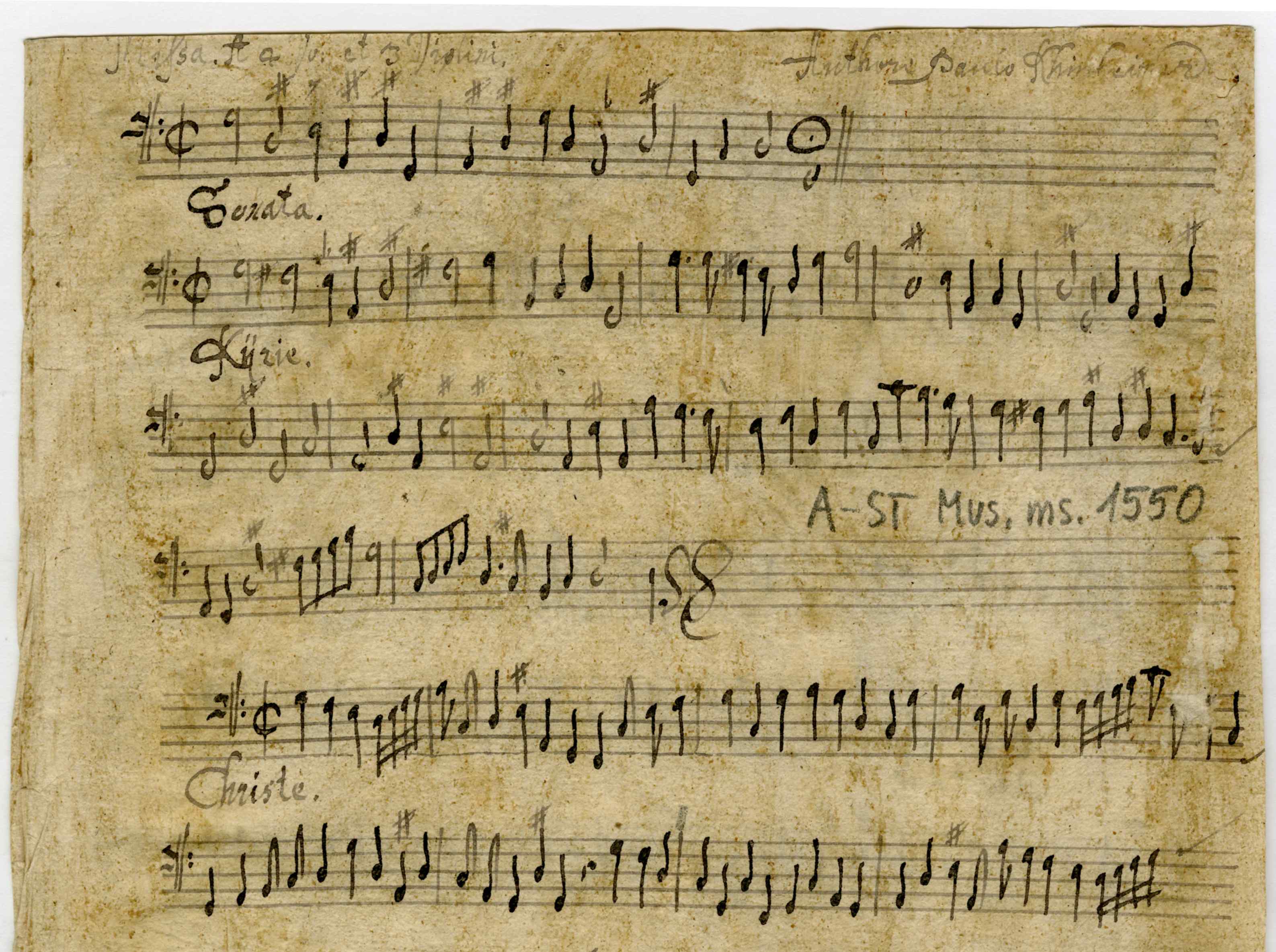 Abb. 1: Anfang der Basso continuo-Stimme (ca. 1670?) zu einer singulär in Stams überlieferten Messe von Paul Kienhaimer, einem hochgeschätzten Zinkenbläser der Innsbrucker Hofmusikkapelle um 1620/30 und 1640/50. Handschrift A-ST Mus.ms. 1550. Abb.: Archiv ITMf.