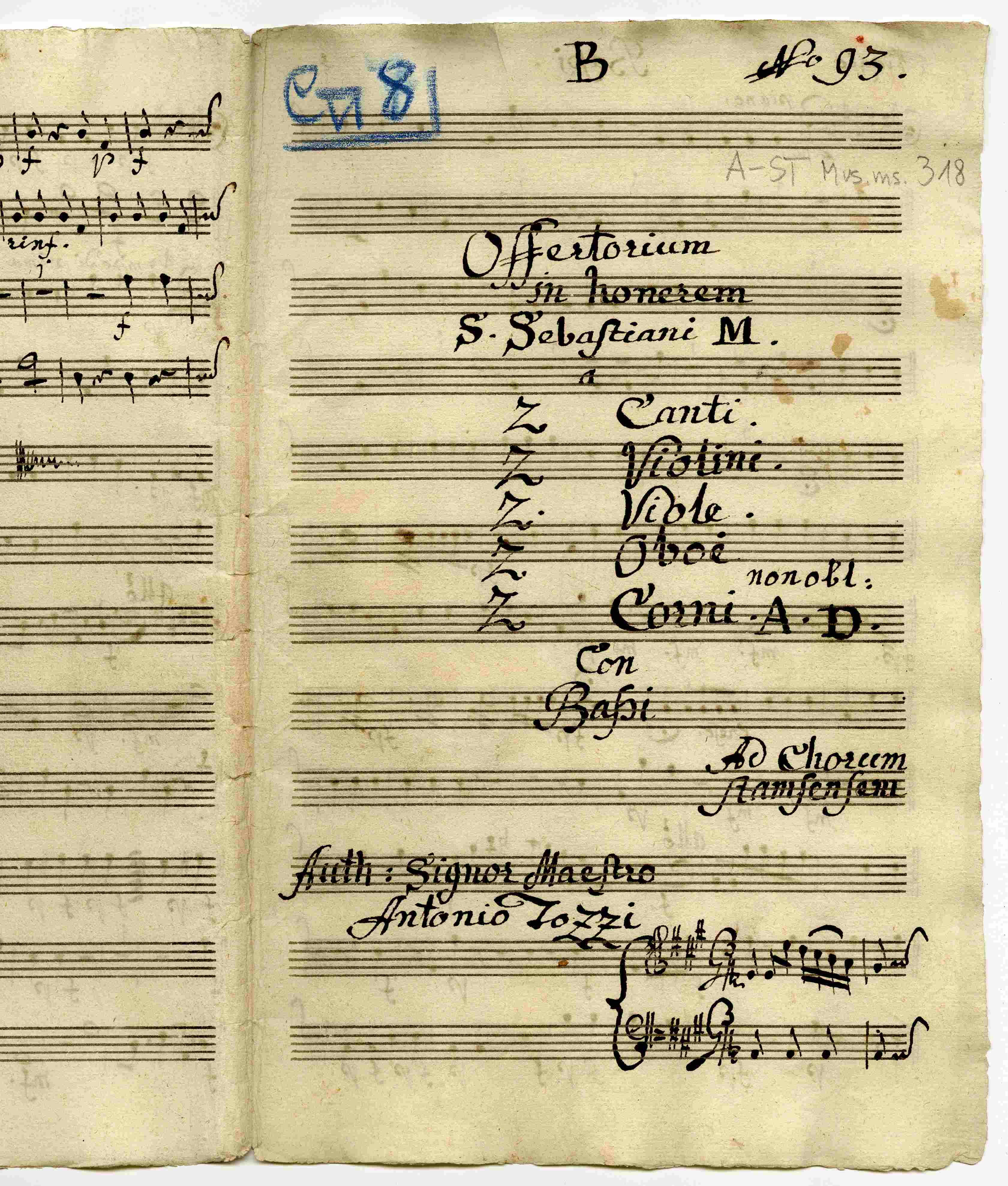 Abb. 3: Titelblatt zum Offertorium „Christi martyr“ von Antonio Tozzi (ca. 1736 - nach 1792), aus Bologna stammender und 1773/75 in München gefeierter Opernkomponist. Wohl Bearbeitung aus einer bislang fraglichen Oper Tozzis, Abschrift von P. Stefan Paluselli OCist, ca. 1775. Signatur A-ST Mus.ms. 318. Abb.: Archiv ITMf. Kompositionen zu Ehren des hl. Märtyrers Sebastian sind für Stams belegt, seit 1636, während die Pest in Tirol wütete, der Maler Paul Honegger († 1649 Innsbruck) für die Stiftskirche ein neues Altarbild geliefert hatte: Es zeigt die drei Pestheiligen Sebastian, Rochus von Montpellier und Antonius den Großen (den Einsiedler) sowie den Stamser Konvent, der sich ihrem Schutz unterwirft (Kunstsammlungen Stift Stams, Inv.-Nr. 298, Abb. zuletzt bei Herrmann-Schneider 2020, S. 201).In den letzten Jahren wurden über die Quellenbeschreibungen im RISM-OPAC hinaus etliche Studien zu Detailfragen der Stamser Musiküberlieferung publiziert, Werkverzeichnisse mit – oftmals singulären – Stamser Belegen bereichert, Notenausgaben vorgelegt, in exemplarischen Konzerten und CD-Editionen (darunter in einer eigenen CD-Reihe Musik aus Stift Stams) durch das Institut für Tiroler Musikforschung in Innsbruck die Klangwelt des Musikarchivs von Stift Stams systematisch und für jedermann erfahrbar erschlossen sowie im Klangraum Tirol komplett online abrufbar gemacht (unter www.musikland-tirol.at). Die Buchpublikation Wo die Engel musizieren. Musik im Stift Stams (Brixen: A. Weger 2020) von Hildegard Herrmann-Schneider präsentiert die Musikpflege im Stift Stams in allen ihren Bereichen sakraler und profaner Musik und geht dem früher herausragenden Stellenwert der Musik an diesem Ort ebenso anhand der hier außergewöhnlich zahlreichen Werke der bildenden Kunst mit Musikmotiven nach, vom 14. Jahrhundert an.