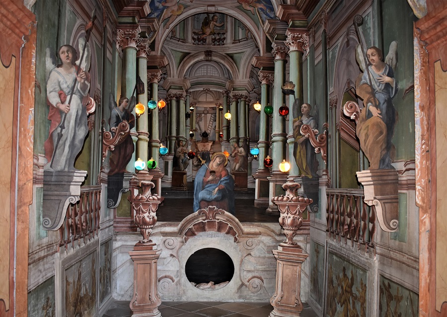 Im Zentrum des Theatrums befindet sich in einer ovalen Öffnung der Leib Christi, der den Betrachter zur Anbetung einlädt. Darüber ist als Silhouttenschnittfigur Maria als Schmerzensmutter aufgestellt, deren Herz ausgeschnitten ist. Wenn sich der Gläubige dabei auf eine bestimmte Fliese kniet, sieht er durch das Herz Mariens hindurch auf das Herz Christi, das, von Leidenswerkzeugen umgeben, auf einen Thron im Hintergrund des Theatrums gemalt wurde. So wird thematisch der Blick des Knieenden durch das Herz Mariens zum Herz Christi geleitet: Symbolisch wird damit ausgedrückt, dass der Weg zum Herzen Jesu durch das Herz Mariens führt. Diese Fliese ist dadurch erkennbar, dass sie durch die vielen Tausenden Knieenden im Laufe der Zeit ausgebuchtet wurde.