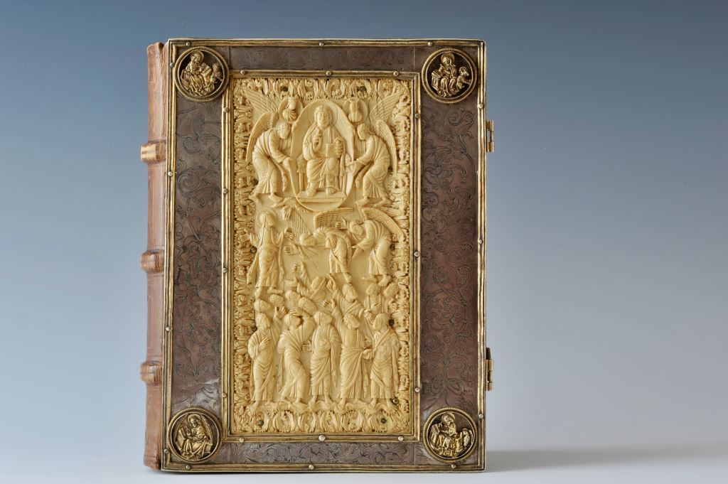 Abb. 3: Buchdeckel, Christi Himmelfahrt, Elfenbeinrelief, Jüngere Metzer Schule, 9. Jahrhundert Rahmen,