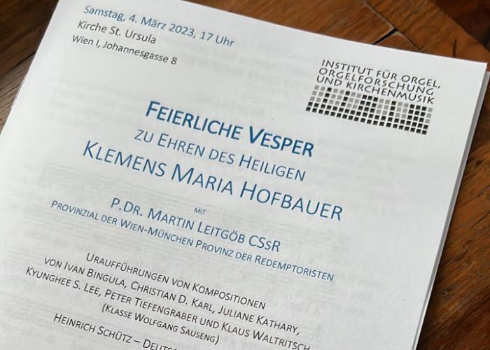 Eine Erstaufführung zeitgenössischer Musik über den Wiener Stadtpatron: Das gab es vergangenen Samstag, dem 4.3.2023, in der Wiener Kirche St. Ursula, wo zu Ehren des dort einst wirkenden Ordensgründers Klemens Maria Hofbauer (1751-1820) eine "Klemens-Vesper" erklang. Kompositionen von Studierenden der Kirchenmusik an der Universität für Musik und Darstellende Kunst Wien begleiteten einen Gottesdienst, der von Redemptoristen-Provinzial P. Martin Leitgöb CSsR geleitet wurde. Die Ansprache hielt Sr. Anneliese Herzig MSsR von den Missionsschwestern vom Heiligsten Erlöser.