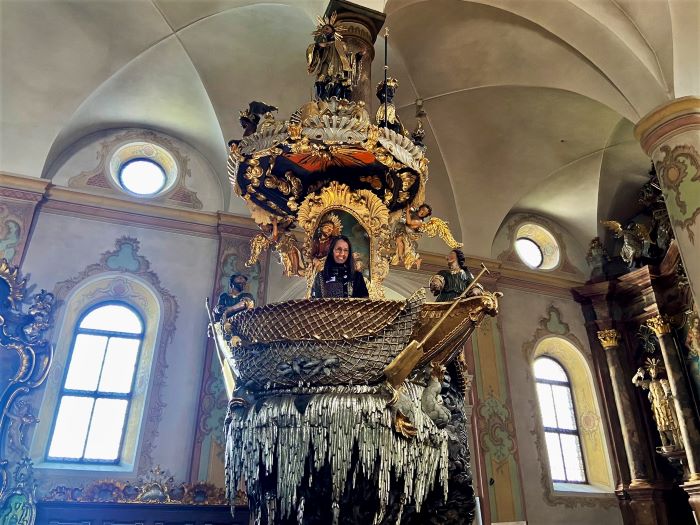 Die Tour begann in der Pfarrkirche Traunkirchen, die für ihre „Fischerkanzel“ berühmt ist. Sie gilt als Meisterwerk der Holzschnitzkunst und beinhaltet eine einmalige Darstellung des Wunders des reichen Fischfangs. Passend dazu wurden die Teilnehmenden eingeladen, in die Rolle einer der dargestellten Figuren auf der Kanzel zu schlüpfen – also zum Beispiel in die Figur des Apostels Petrus oder eines Fisches. Anschließend konnten sie ihre Empfindungen von der Kanzel aus mitteilen.