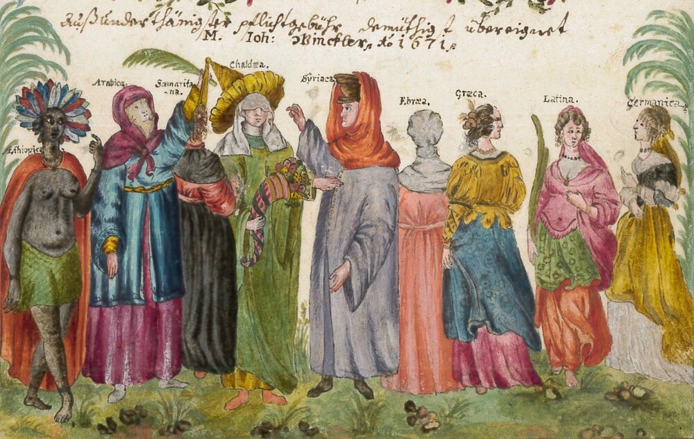 Das vielleicht außergewöhnlichste Bibliotheksexemplar punkto Sprachenvielfalt ist aber eine Handschrift aus dem Jahr 1671. Verfasst wurde sie von Johann Winckler (1642-1705), dem Erzieher der Söhne des Herzogs Philipp Ludwig von Schleswig-Holstein-Sonderburg. Seinem Arbeitgeber ist das Werk auch gewidmet, das in verschiedenen orientalischen Sprachen Gebete und Lobhuldigungen auf die Herzogsfamilie enthält, samt deutscher Übersetzung und der Anleitung, wie die Texte im Original auszusprechen sind. Das farbenfrohe Titelblatt zeigt die Sprachen als Personen dargestellt, in bunten Kleidern, mit auffälligem Kopfputz und akkuraten Frisuren. Noch ist es ein Rätsel, wann und wie das Buch in die Bibliothek gelangt ist. Die Antwort dürfte aber mit der „Fruchtbringenden Gesellschaft“ zu tun haben, der wirkmächtigsten deutschen Sprachgesellschaft der Barockzeit. Ihr Ziel war es, Deutsch als Literatur- und Gelehrtensprache zu etablieren und damit das Lateinische abzulösen.