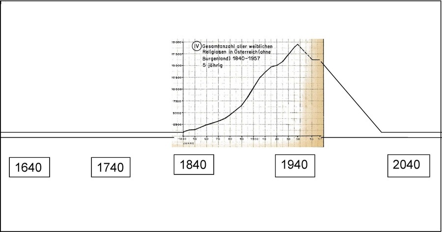 Die Erneuerung des Ordenslebens wurde – bei den Frauenorden viel stärker als bei den Männerorden – stets auch unter dem Aspekt der Rekrutierung von Ordensnachwuchs gesehen. Hatte sich die Anzahl der weiblichen Religiosen in Österreich zwischen 1830 und 1930 verzwanzigfacht, fallen die Zahlen seitdem rapide ab.44 Ein Zeitphänomen ging zu Ende und eine neue Zeit war angebrochen.
