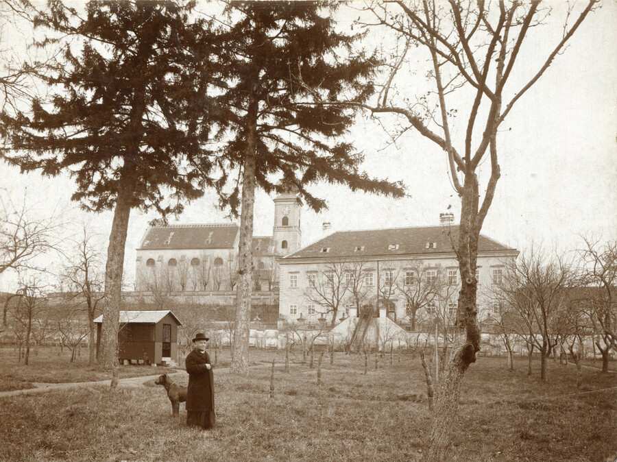 Abb. 5: Obwohl vordergründig ein Porträt des Pfarrers P. Roman Kohlhofer, wurde das Bild als eine frühe fotografische Aufnahme von Pfarrkirche und Pfarrhof von Gaunersdorf (heute Gaweinstal) dem Ort zugeordnet (1898). AT-SCHOTTEN/StiA 14.Bild 6/Gawe.K.A.01.b.