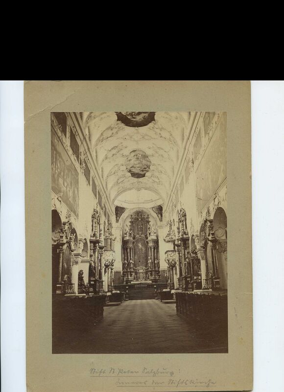 Abt Albert Nagnzaun (1818–1856) ließ 1823 um 2019 Gulden 18 Kreuzer eine Reinigung und Weißigung durchführen,12 die bis 1884 Bestand hatte, als Abt Romuald Horner (1876–1901) um 13.056 Gulden 77 Kreuzer die Kirche erneut renovieren ließ.13 In beiden Fällen erstellten der Abt bzw. der von ihm beauftragte Prior eigenhändig die Kostenübersicht. Abt Romuald ließ die Kirche mit einer Gasbeleuchtung ausstatten, manche Figuren neu fassen, Reliefs des Künstlers Johann Piger hinzufügen und das Kircheninnere neu ausmalen.14 Dem Zeitgeschmack entsprechend wurden Gelb- und Brauntöne anstatt der weiß-grünen Gestaltung der Barockzeit gewählt. Damit nahm man dem Kircheninnenraum die helle, freundliche Lichtwirkung, was auf den erhaltenen Fotografien deutlich zu erkennen ist (Abb. 4 und Abb. 5).15