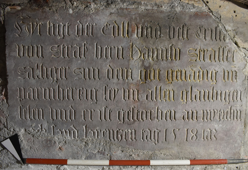 Auf die Ergebnisse aus den begleitenden archäologischen Maßnahmen darf man gespannt sein. Bei laufenden Arbeiten wurde das Archiv der Erzabtei St. Peter auf zwei Epitaphfragmente aufmerksam gemacht, die sich nebeneinander an nicht zugänglicher Stelle im nördlichen Seitenschiff befinden.26 Das erste Fragment zeigt das Überack’sche Wappen,27 während das zweite den Inschriftentext des Epitaphs auf Christoph Strasser enthält, der wie folgt lautet:28