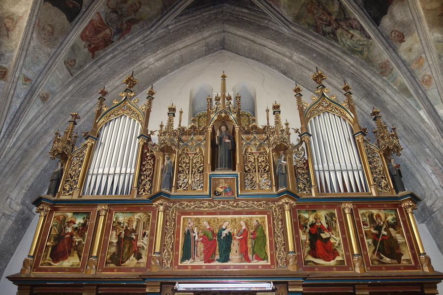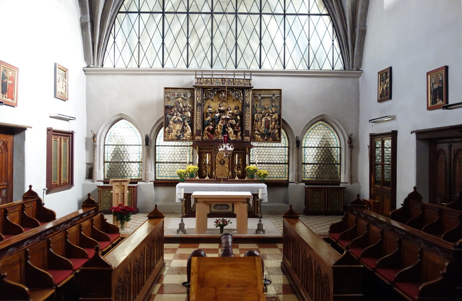 An die Westwand der Kirche schließt unsere Chorkapelle an, das Herzstück unseres Hauses, in der wir Tag für Tag beten und Gottesdienst feiern. Wie die Kirche strahlt auch die Chorkapelle mit ihrem Flügelaltar, den Wandbildern und den Bildtafeln am Orgelprospekt die schlichte Schönheit der Gotik aus. Jene Schönheit, die den Blick emporzieht, auf das Himmlische lenkt, das sie abbilden möchte, um unsere Sinne dadurch für die Gegenwart Gottes zu öffnen. (Abb. 4, 5)