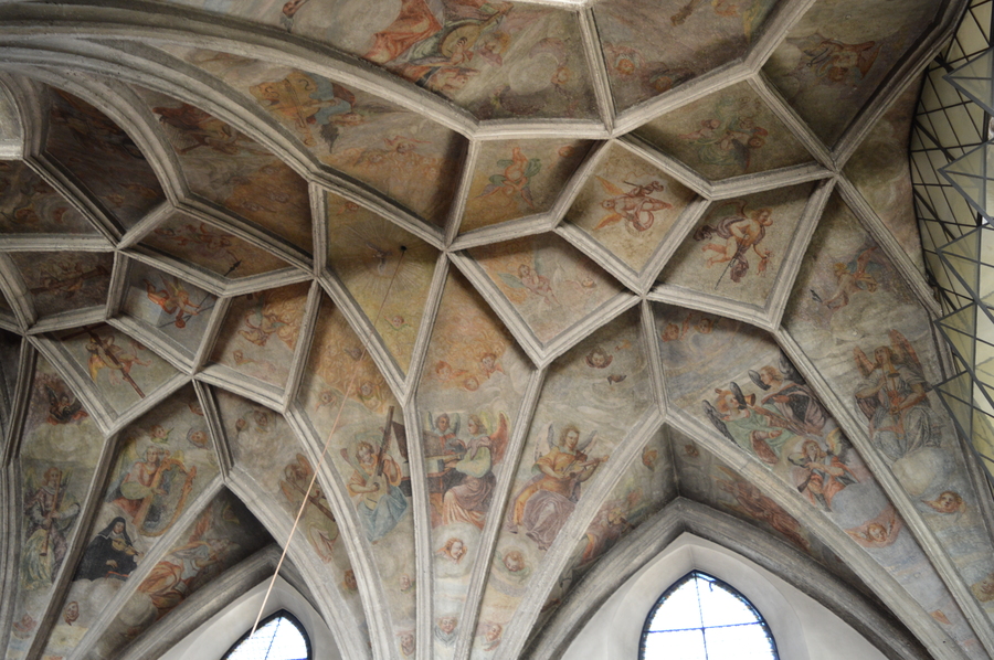Im Deckengewölbe geben frühbarocke Fresken aus dem Jahr 1625 gleichsam den Blick in den Himmel frei, auf eine große Schar von zum Teil musizierenden Engeln, denen sich auch drei Nonnen beigesellen. So wird für uns der Psalmvers „Vor dem Angesicht der Engel will ich dir Psalmen singen.“ (Ps 138,1), den der hl. Benedikt in seiner Regel zitiert, während des Gebets ganz real erfahrbar. (Abb. 6)