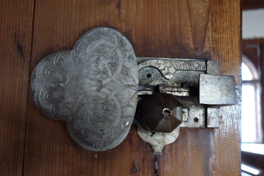 Mich beeindrucken aber nicht nur diese Zeugnisse einer sorgfältigen Verwendung der Dinge, sondern auch mit wie viel Sorgfalt und Liebe zum Detail Dinge früher hergestellt wurden – die Beschläge der Schlösser an der Innenseite von Kastentüren wurden alle kunstvoll verziert. (Abb. 9)