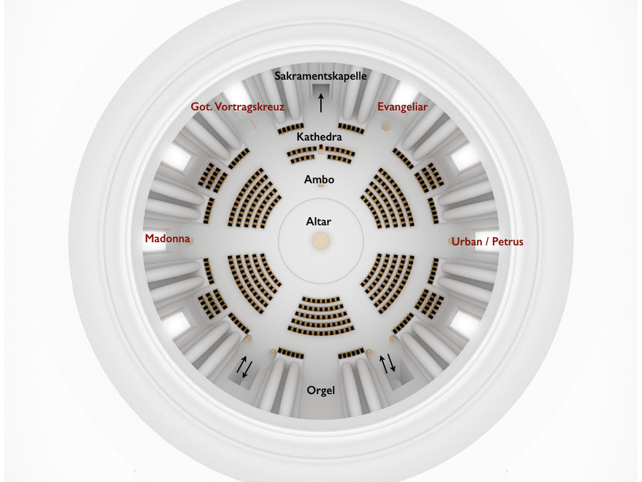 Was ist nun am aktuellen Endergebnis, dem kreisförmig organisierten Communioraum, so besonders? Nun, der Mehrwert dieses Modells besteht darin, dass die Gemeinde plötzlich in einem Raum, in einem ungeteilten Raum feiert.