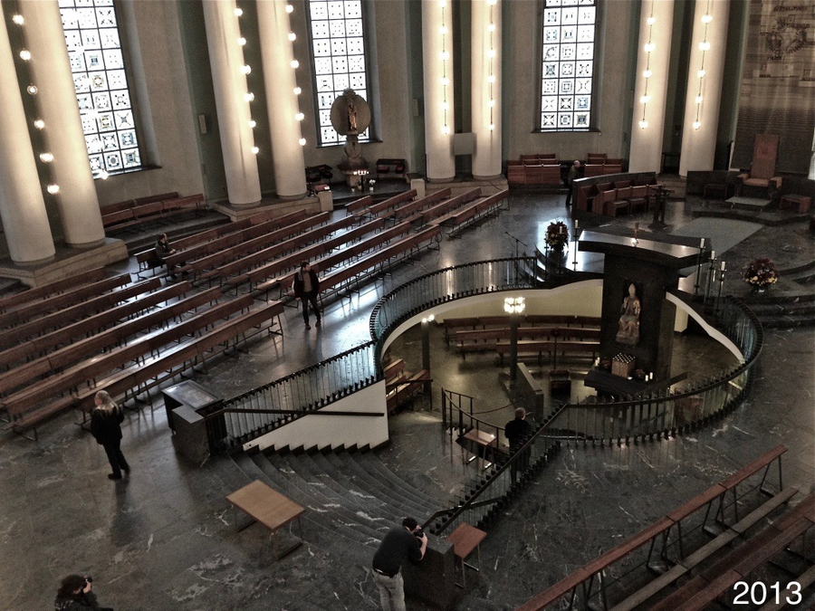 Der Wettbewerbsentwurf, den ich 2014 gemeinsam mit den Architekten Sichau & Walter aus Fulda eingereicht habe. Ungewohnt ist natürlich der zylindrische Zentralraum. Ich sage lieber Einraum oder Rundraum, denn die Zentralisierung ist hier nicht das alleinige raumliturgische Thema und schon gar nicht das wichtigste. Wesentlich ist in dieser Konzeption, dass die Communio nicht in Klerus und Laiengemeinde, der Raum nicht in Altarraum und Gemeinderaum geteilt ist. Das ermöglicht eine ganz neue Intensität der Liturgie und stärkt auch den Priester, der nun inmitten der Gemeinde, mit der Kraft der versammelten Gemeinde agieren kann und von der irritierenden Konfrontation zwischen Zelebrant und Gemeinde befreit ist. Hier in der Berliner Hedwigskirche bietet sich die konsequente Einrichtung eines Communioraumes an. Die Diskussion um die Eignung des Zentralraums für die christliche Liturgie ist ihnen bekannt. Worin liegt eigentlich der entscheidende Unterschied zur Wegkirche? Klingt ja nicht weiter verdächtig: Wegkirche. Weg ist ja gewiss nichts Schlechtes. Die Topologie des Weges kann man sehr vielfältig interpretieren. Aber die Pointe der sogenannten Wegkirche ist ja, dass der Weg plötzlich nicht mehr weitergeht. Ob das früher Lettner waren, später Kommunion-Schranken (!), Altarstufen oder eine Altar-Insel (!) – der Altar auf einer Insel. Welche Theologie oder besser welche Ideologie steckt da dahinter?