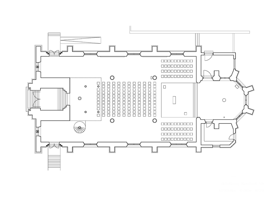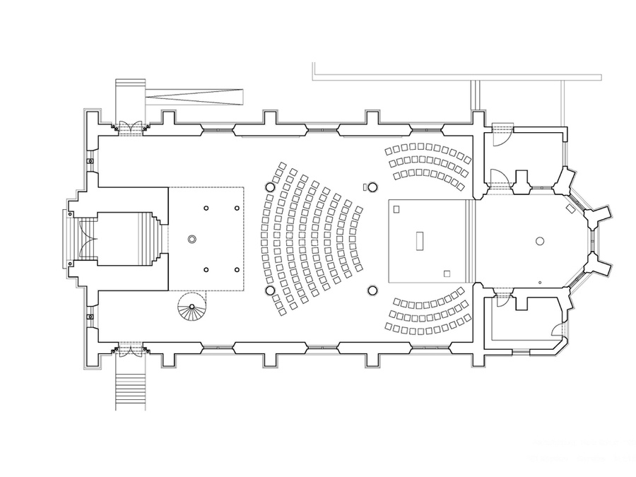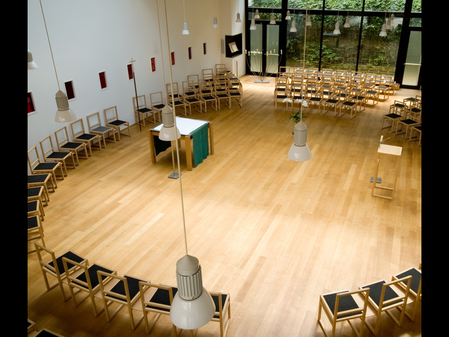Schauen wir noch kurz in die Kirche St. Paulus in der Tervurenlaan in Brüssel, einer besonderen Variante von Communio-Raum. Diesmal in einer neugebauten Kirche, die im Jahr 2001 eingeweiht wurde. Der Grundriss ist ein langgestrecktes Rechteck, 10 x 20 Meter. Viel zu klein für bis zu 200 Besucher am Sonntagvormittag. Die Herausforderung bestand nun darin, die Einrichtung so zu gestalten, dass nicht der Eindruck eines Stuhllagers entsteht. Ich habe für diese Kirche besonders schlanke und transparente Stühle entworfen. Das ging ein wenig zu Lasten des Sitzkomforts, doch bewahrte der Raum seine durchlässige Optik und wirkt nun doch nicht übermöbliert.
