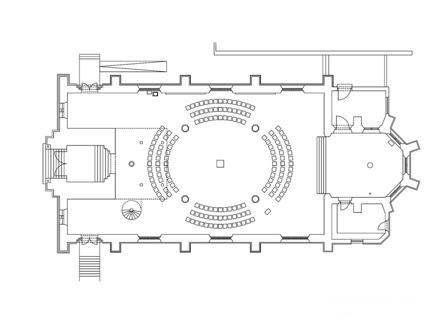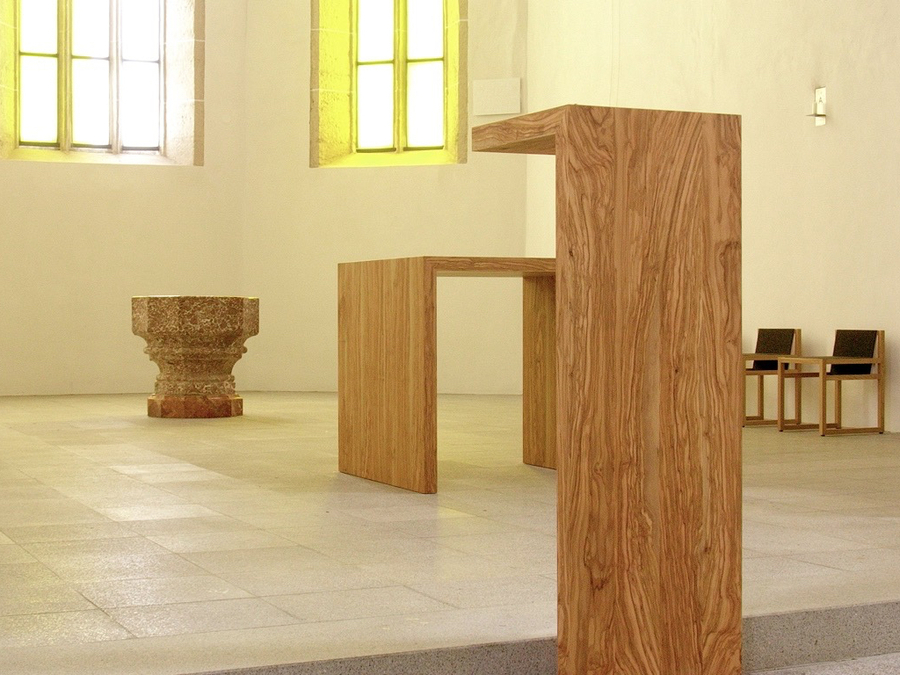 Maria Geburt, eine neugotische Pfarrkirche in Aschaffenburg, war mein erstes raumliturgisches Projekt. Der Planungsprozess begann 1992, die Einweihung war 1999. Nachdem die Neugestaltung der Kirche abgeschlossen war, begann ein intensiver Prozess der Entwicklung einer adäquaten Liturgie für die Menschen unserer Zeit. Nach etwa sieben Jahren haben wir das offene Rechteck zu einem Dreiviertelkreis umgestellt. Und nach weiteren zehn Jahren wanderte der Altar in die Mitte der Hallenkirche. Nachdem ich ab dem ersten Projekt Stühle für die Kirchräume entworfen habe und dezidiert keine fixen Bänke, konnten wir die Sitzordnung ohne großen Aufwand umstellen. Die Gemeinde in Aschaffenburg nutzt diese Möglichkeit der Variabilität der Versammlungsform übrigens im Laufe des Kirchenjahres immer wieder. Die Grundaufstellung sehen sie in den drei Plandarstellungen.