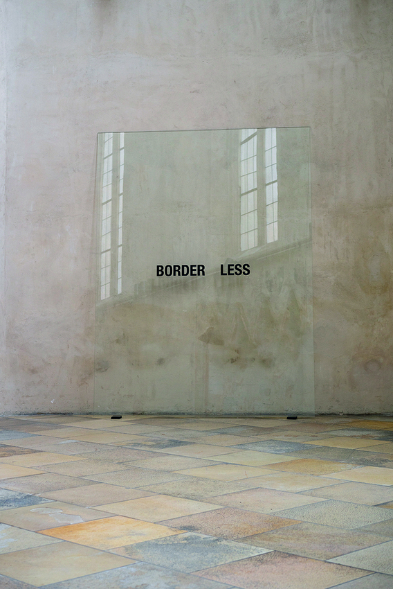 Eine große Glastafel mit der Aufschrift BORDER LESS lehnte an einer Wand der Apsis. Man kann das Wortspiel nicht ins Deutsche übersetzten, aber ich glaube Sie verstehen das alle. Man liest BORDER – LESS und weiter wahrscheinlich LESS BORDER oder als Aufforderungssatz: Border less! Border nun als Verb. Und so weiter. Die knappe Botschaft darf dann nachklingen. Sie gilt in allen menschlichen Bereichen – politisch, zwischenmenschlich, spirituell, theologisch – auch in der Liturgie! Grenzen sind immer kulturell gesetzt. In der Wirklichkeit existiert keine Grenze. Grenzen sind Hilfskonstruktionen im Kopf, und wenn wir sie stark machen, zum Beispiel politisch – das muss ich jetzt gar nicht weiter ausführen. Das haben wir gerade in den letzten Jahren viel erlebt und wir erleben es weiter.