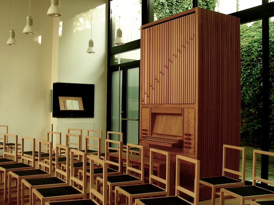 Wenige Jahre nach der Einweihung kam ein neuer Pfarrer, ein begeisterter Kirchenmusiker. Die vorhandene kleine Truhenorgel stellte ihn nicht zufrieden. Die Gemeinde kontaktierte mich in großer Sorge. War es möglich, eine Orgel so zu gestalten, dass sie in diesem schlichten, horizontal geprägten Raum nicht alles dominiert und zu einer Art Hochaltar wird? Ich habe gemeinsam mit dem niederländischen Orgelbauer Henk Klop ein Instrument entwickelt, das sich gut einfügt. Wer genau hinschaut, sieht, dass das Orgelgehäuse Formelemente der Bestuhlung zitiert und die minimalistische Ästhetik des Instruments mit der liturgischen Einrichtung der Kirche ein harmonisches Gesamtbild ergibt. Die Formgestalt folgt radikal funktionalistisch den physikalischen Erfordernissen des Instrumentenbaus. Sichtbar wird dieses Gestaltungsprinzip in der Kurve der Labien. Die elegante abgetreppte Linie ist das einzige Ornament an diesem Orgelgehäuse und kommt sozusagen vom lieben Gott.
