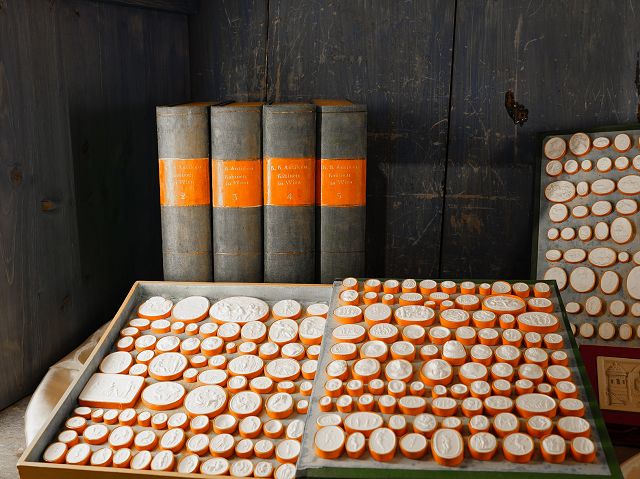 Glaspaste, Gips, Schwefel oder Siegellack wurden verwendet und waren allgemein anerkannte Materialien. Aus ihnen wurden herzeigbare Abdrücke antiker Gemmen, Kameen, Büsten und Statuen angefertigt.24