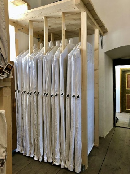 Während also die kunsthistorische Bearbeitung und die Inventarisierung und Konservierung der Objekte voranschreitet und die Haustechniker die Konstruktionen für das neue Depot eins ums andere umsetzen, erweitert sich der Kreis der zahlreichen Helfer und Mitarbeiter abermals um eine freiwillige Helferin, Teresa Reischel. Sie wird unermüdlich für jedes Objekt anhand von Listen mit den Objektmaßen und -formen die Hussen maßschneidern. Auch ihr wird ein eigenes Zimmer im Konvent als Arbeitsplatz für ihre Bedürfnisse eingerichtet.
