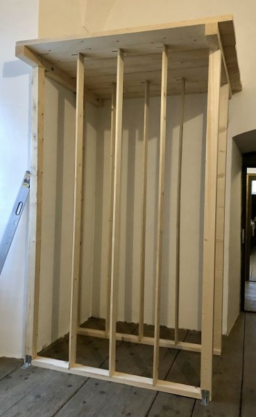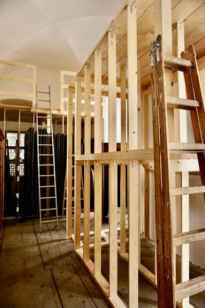 Abb. 11: Zweistöckige Konstruktion für die mittleren Formate, rechts entlang der Mauer ist der Zugang für die Manipulation der Objekte. Karmelitenkonvent Linz (c) Barabas