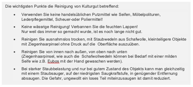 E benso sind die regelmäßige Reinigung von Depoträumen (immer trocken und Staubsauger mit HEPA–Filter) sowie die korrekte Handhabung von Objekten ein relativ einfaches wie effektives Instrument für optimale Lagerbedingungen.