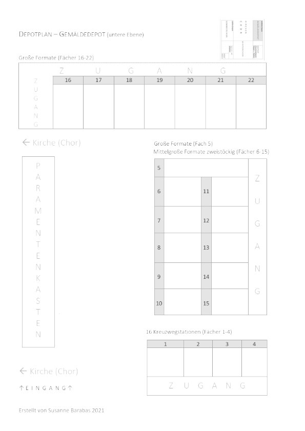 Eine ausgedruckte Liste der Objekte mit der Inventarnummer, den wichtigsten Metadaten und einem Vorschaubild ist vor Ort zugänglich. Depotpläne liegen im Depot als Orientierungshilfe auf, die die Aufstellungssystematik im Depot auf einen Blick sichtbar und nachvollziehbar machen.
