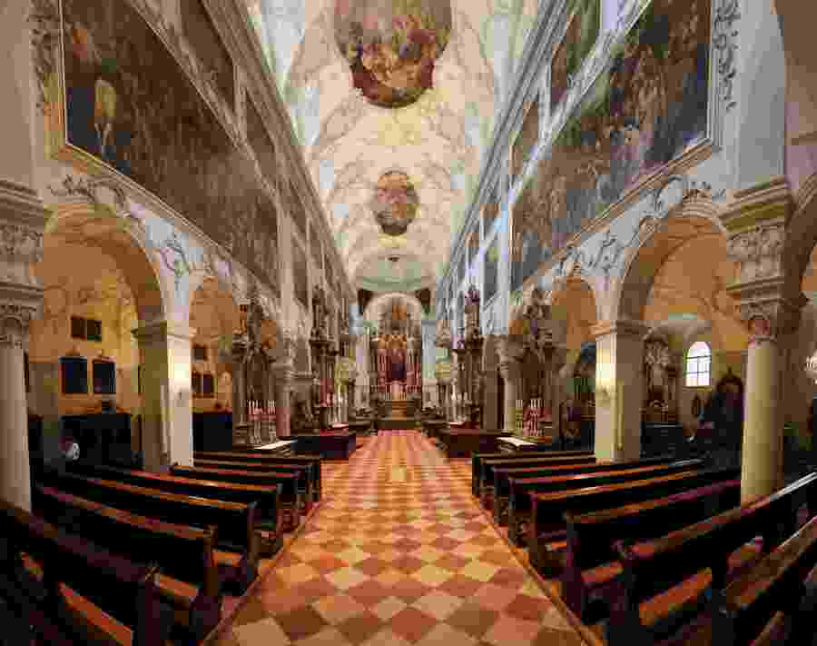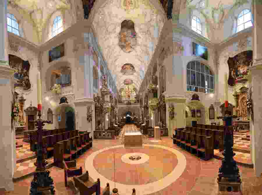 Abb. 2-3: Blicke in das Langhaus der 2018–2019 unter Erzabt Korbinian Birnbacher OSB renovierten Stiftskirche St. Peter. (Fotos: Friedrich Nill)