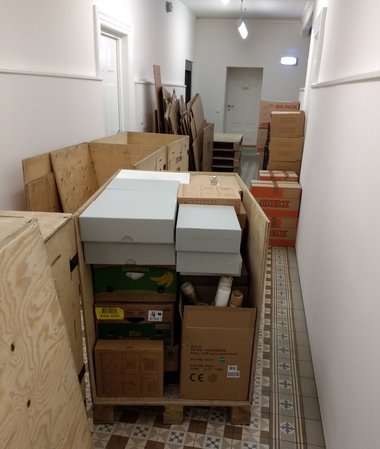 Abb. 5: Paletten mit Archivschachteln vor dem Eingangstor in Wien. © Lukas Winder