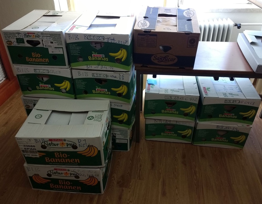 Mengenmäßig und zeitlich weniger ins Gewicht fiel die Verpackung für unser Arbeitsmaterial sowie unsere Büroausstattung, was wir naheliegenderweise erst kurz vor dem Umzugstermin erledigten. Die noch ungenutzten und daher noch gefalteten Archivschachteln, sowie Mappen, Umschläge und Papiere konnten wir direkt in ihrer Originalverpackung belassen. Kleinere Hilfsmittel wie Reinigungsschwämme oder Kleber fanden zusammen mit dem üblichen Büromaterial in weiteren Bananenschachteln Platz. Wichtig für uns war, dass unsere Computer samt allen Peripheriegeräten und Bildschirmen zusammen mit unserem NAS-System mittransportiert wurden, damit wir am neuen Arbeitsplatz in Wien möglichst bald unsere reguläre Arbeit wieder aufnehmen konnten. Zuletzt nahmen wir das in Riedenburg in Betrieb befindliche Luftentfeuchtungsgerät, unseren praktischen Archivwagen und zwei Metallschränke in unsere Packliste auf, da wir diese auch im neuen Archivdepot weiterbenutzen wollten. Verpackt mussten diese allerdings nicht werden. Die Verpackung ist für (Archiv-) Umzüge entscheidend, weil nur stabil verpackte Dinge bei einem Umzug verlässlich ohne Schäden transportiert werden können. Es ist vielleicht nicht möglich, alles gleich in passende säurefreie Archivschachteln mit basischer Pufferung zu verpacken, womöglich weil es zu wenig davon gibt, die Formate nicht passen oder – was für uns zutraf – weil wir zur einfachen Abgrenzung möglichst nur bereits verzeichnetes Archivgut in Archivschachteln aufbewahren wollten. Allerdings sollten Archivar:innen speziell bei der Nutzung von frisch erworbenen handelsüblichen Schachteltypen bewusst sein, dass diese von Schädlingen wie (Silber-/Papier-) Fischchen befallen sein könnten. Das kann gerade bei Bananenschachteln ein Problem werden, denn diese könnten aus möglicherweise kontaminierten Lagern kommen. Daher ist es – auch außerhalb von Umzügen – bei der Aufnahme von neuen (Archiv-) Schachteln oder Papieren immer ratsam, diese zur „Quarantäne“ in eigene Räume oder abgetrennte Bereiche zu geben und mit Hilfe von Klebefallen zu kontrollieren, ob Schädlinge mitgeliefert wurden.18 In unserem Fall lagerten die Bananenschachteln bereits mehrere Wochen in einem trockenen Raum, sodass wir diesbezüglich zum Glück keine Probleme hatten.