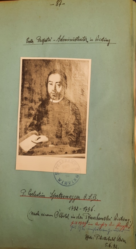Abb. 5: Mischformen ergeben viele Einsichten. Die abgebildete Archivalie ist Bildchronik und Kunstinventar zugleich, erstellt von P. Willibald Meier von St. Peter im Kriegsjahr 1942. Obwohl die Photographie bedarfsmäßig einfach ist, kann man die Amtszeit eines Administrators gut erschließen, wie auch die Sorge um das abgebildete Gemälde. Spätere Einträge datieren gewissenhaft den weiteren Weg des Kunstwerkes in der Nachkriegszeit. Bildchronik der Propstei Wieting in Kärnten, 20. Jahrhundert (ASP, Photo A 134).