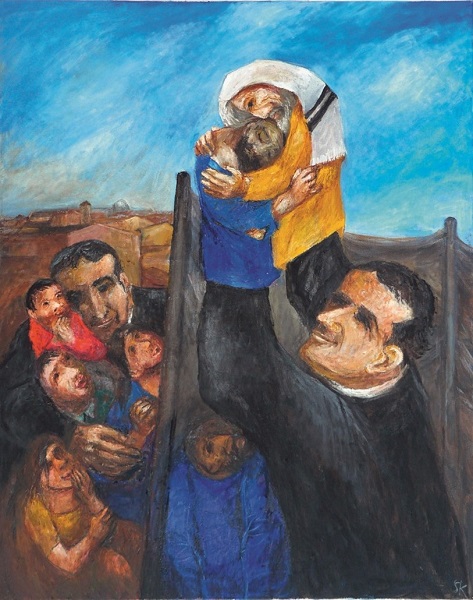 In der biblischen Szene vom barmherzigen Vater spielt Giovanni Bosco, der so früh Halbwaise geworden war, sich selbst – als „Vater“ der jungen Menschen, denen er den Schutzraum bot, in dem sie Geborgenheit und Liebe erfahren konnten. Der Künstler hat ihn auf der linken Seite nochmals gemalt, mitten unter den Kindern und Jugendlichen, denen er sich liebevoll zuwendet. Don Bosco – ein Verkünder mitten in der Welt. Er ging auf die Straßen und Plätze – für ihn der erste Ort seiner Pastoral.63 „Dort hält er die Botschaft vom barmherzigen Vater hoch, den Menschen und dem Himmel entgegen.“64