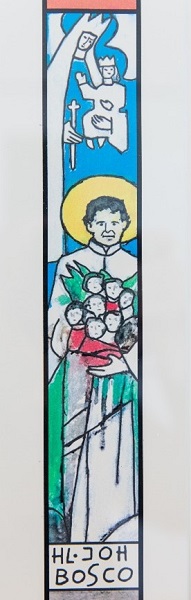 Don Bosco sah das Schöne und Gute in den jungen Menschen. Die Glasmalerei88 des polnischen Salesianer-Künstlers Tadeusz Furdyna89 bringt dies künstlerisch zum Ausdruck. Reinhard Gesing SDB90, aktueller Provinzial der Deutschen Provinz der Salesianer Don Boscos, meditiert darüber: Wir sehen Don Bosco in einem weißen Talar, über ihm Maria mit ihrem Kind Jesus. Als himmlische Mutter schaut sie liebevoll auf ihr irdisches „Kind“ Giovanni Bosco. Ihr Mantel reicht bis zu dessen Schultern, was die tiefe Verbundenheit der beiden symbolisiert. Das Jesuskind zeigt mit beiden Händen auf Maria, seine Mutter – was bemerkenswert ist, weil oft umgekehrt Maria auf ihren Sohn verweist.
