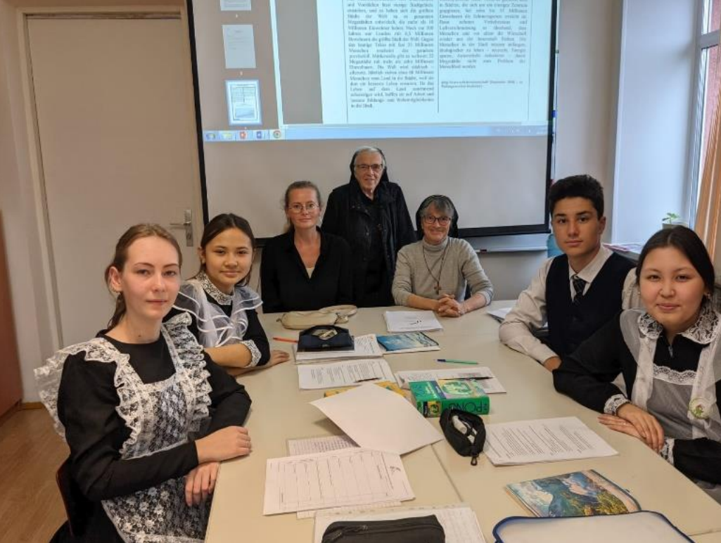 Die Schüler:innen in Kasachstan lernen vier Sprachen in der Schule: Kasachisch, Russisch, Englisch und Deutsch. Sr. Kunigunde Fürst (mitte) unterrichtet Deutsch. © privat Fotodownload