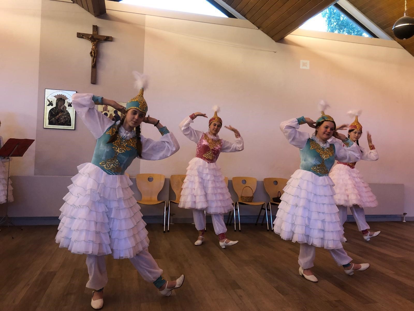 Schüler:innen aus Kasachstan führen einen traditionellen Tanz auf. © privat Fotodownload