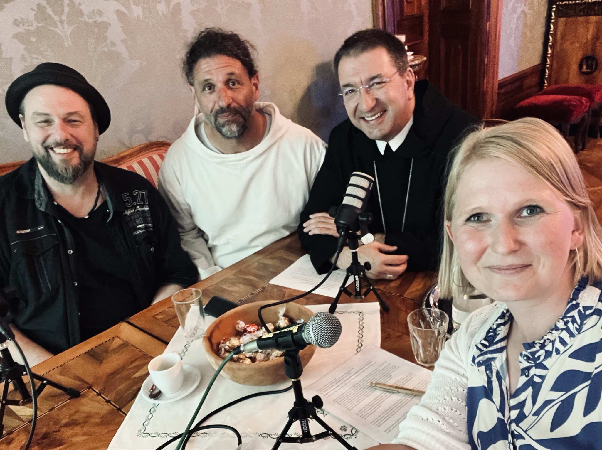Fangen Geschichten ein: Robert Sonnleinter (li.) und Renate Magerl (re.) bei der Podcast-Aufnahme mit Br. Thomas Hessler (2.v.l.) und Erzabt Korbinian Birnbacher (3.v.l). © ÖOK Fotodownload